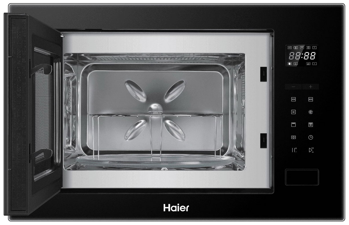 Встраиваемая микроволновая печь Haier HMX-BTG259B займет достойное место на кухонном столе, будет особенно эффектно смотреться в тандеме с черной духовкой или плитой. Вместительная камера на 25 л дополнена поворотным столом со стеклянным блюдом диаметром 31.5 см и грилем. Вы можете использовать 8 автоматических программ, включая режимы разогрева и разморозки.